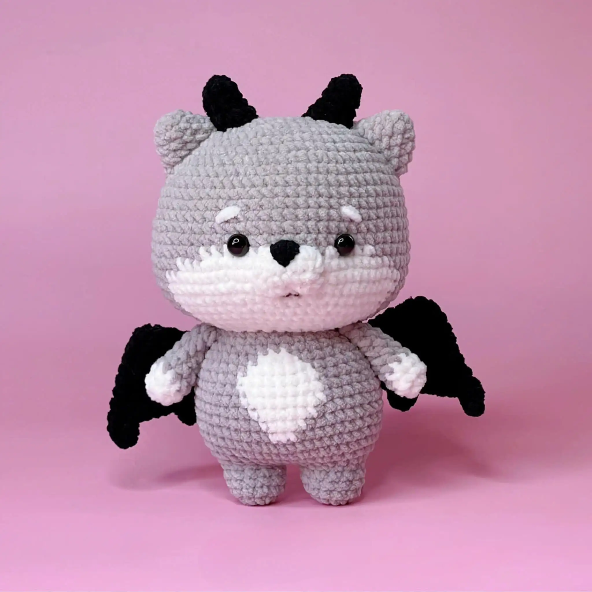 Thú nhồi bông có tông màu xám chủ đạo, kết hợp với màu trắng ở phần bụng và các chi tiết nhỏ. Đôi cánh và cặp sừng màu đen tạo điểm nhấn nổi bật trên nền màu xám. Sự kết hợp hài hòa giữa các màu sắc này tạo nên một sản phẩm vừa đáng yêu vừa cá tính.